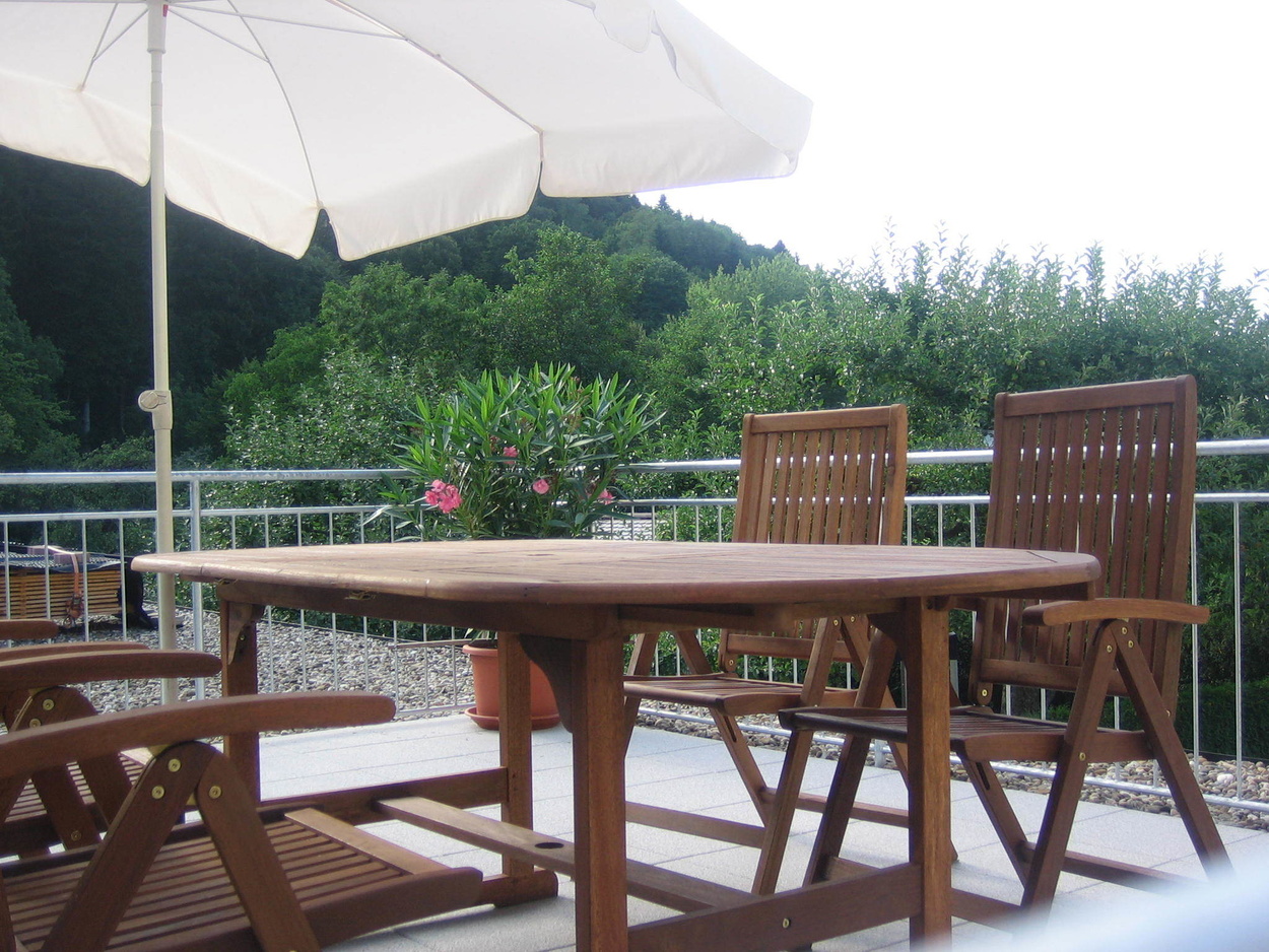 In der modernen Wohnküche finden Sie alles, was zu einer gehobenen Ausstattung gehört: 4-Plattenherd mit Backofen, Dunstabzug, Spülmaschine, Kühlschrank, Wasserkocher und Kaffeemaschine. Vom hellen, geräumigen Schlafzimmer aus haben Sie Blick in den Garten. Das Bad ist mit Dusche, WC und Waschmaschine ausgestattet. Im Wohnzimmer befindet sich eine Sitzgruppe mit Tisch, Sat-TV und Stereoanlage. Die eine Couch ist ausklappbar und ergibt eine zusätzliche Schlafmöglichkeit für 2 Personen (Liegefläche von 1,40 x 2,00 m). Vom Wohnzimmer aus geht es auf die Terrasse, dem "Goldstück" dieser Ferienwohnung. Die gemütlichen Holz-Sitz-Möbel laden zum Entspannen und Essen im Freien ein. Hier können Sie ausruhen und die Aussicht auf die umliegenden Schwarzwaldberge genießen.Bilder: Unsere Ferienwohnung Goldbergblick