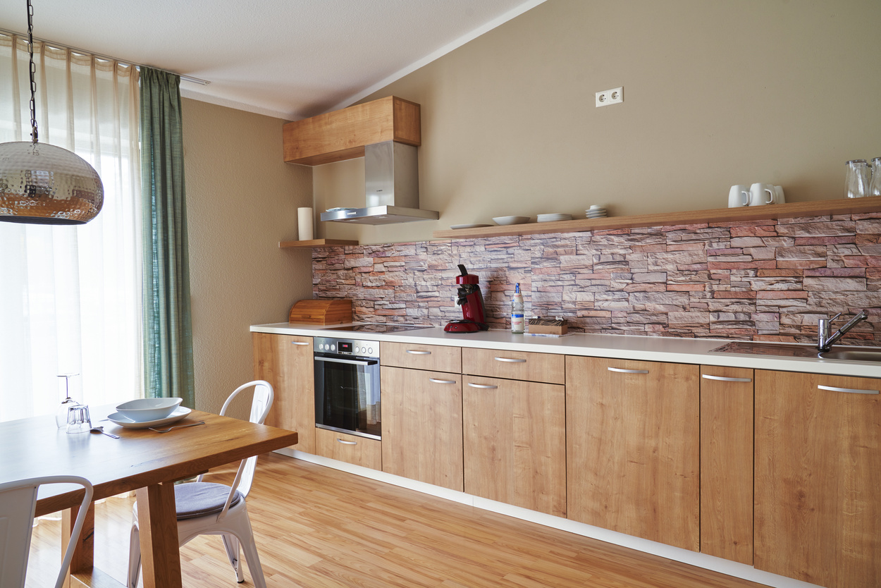 • Wohn & Esszimmer, Küche: Sofa, 2 Sessel, Couch-Tisch, Sat-TV, Esstisch mit 6 Stühlen, Einbauküche, Kühlschrank, Backofen, Spülmaschine, Kaffeemaschine (Filter und Pad), Wasserkocher und Geschirr.