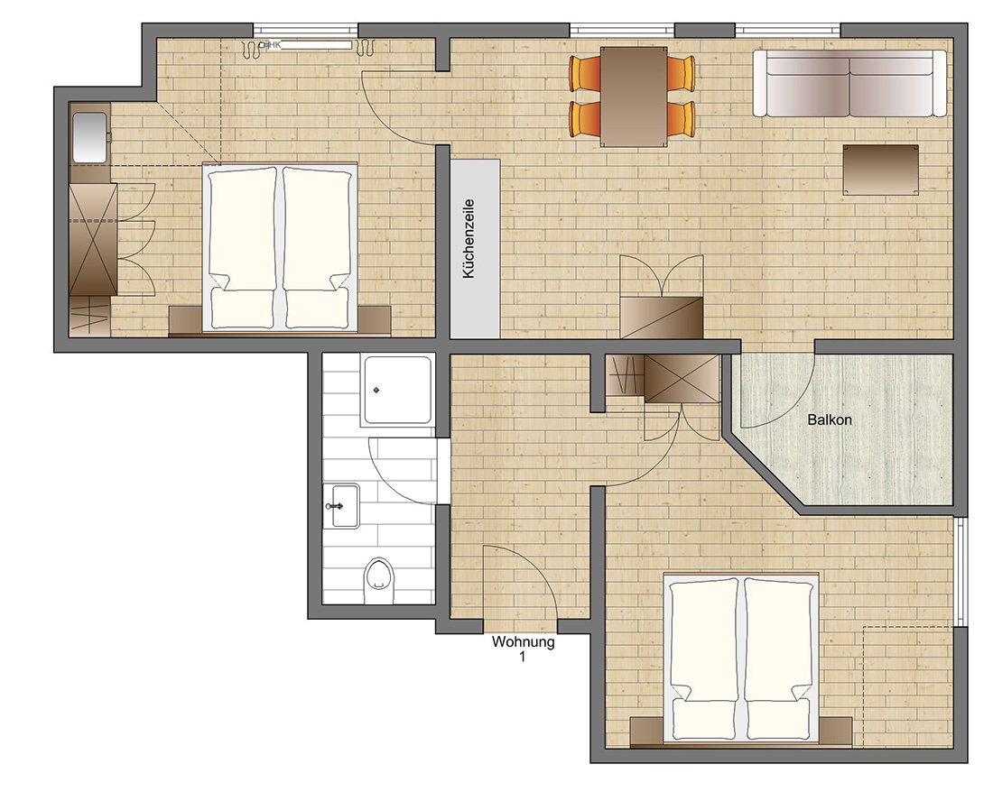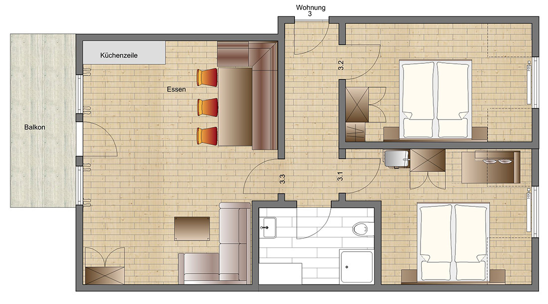 - 2 Schlafzimmer mit Doppelbetten