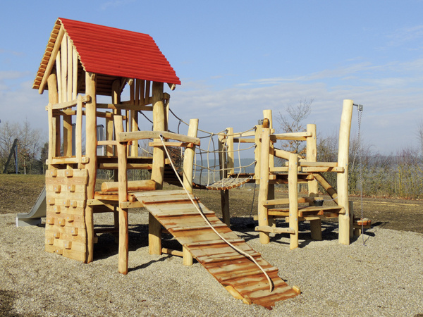 Auf dem Spielplatz gibt es Balancierstangen, Kletterebenen, Tarzanbrücken, zwei Türme und eine rießeige Erlebnisschaukel.